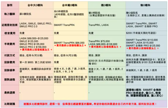 手術費用:SMART TransPRK $110000、LASIK $115000、SMAR全飛秒 PRO $125000