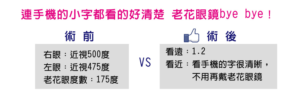 經過1個月的視力恢復期後,鄭博士現在看遠的視力1.2,看近的手機、報紙文字,都很清楚,達到她心目中完美的老花矯正手術,和眼鏡說bye bye!