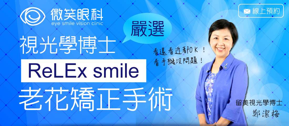 鄭博士是留美的視光學博士,是驗光的專家,許多民眾都是經由她專業的能力,確認自己眼睛屈光不正情形,所以鄭博士特別注重眼睛的健康,自從她知道德國蔡司有SMILE全飛秒雷射,了解它不用掀角膜瓣,對角膜的破壞最小、角膜的恢復期變快,2-4mm的微創切口和市面上其他的老花近視雷射的傷口22-28mm相比,SMILE全飛秒雷射的安全性更高、雷射的度數也更精準、乾眼的情形更是大幅降低,於是她一直在等待這台儀器的引進。直到2014年,SMILE全飛秒雷射拿到了台灣的衛福部許可字號,微笑眼科更是率先引進了SMILE全飛秒雷射的技術,這讓鄭博士欣喜若狂,排除忙錄的工作,準備接受她心目中最完美的老花近視手術。在經過精密的術前檢查後,鄭博士的角膜厚度足夠,也沒有乾眼症及其他眼疾,所有條件適合做SMILE全飛秒雷射。在度數方面,醫師建議將主利眼右眼500度的近視完全矯正到沒有度數,左眼則留175度的近視來調節老花。鄭博士說:「一眼平度數完全校正,一眼保留度數來調節老花,英文叫Monovision『單眼視力』,主要是透過大腦視覺中樞自動的『融像』,功能,就能達到看遠、看近都清晰的視覺品質。」